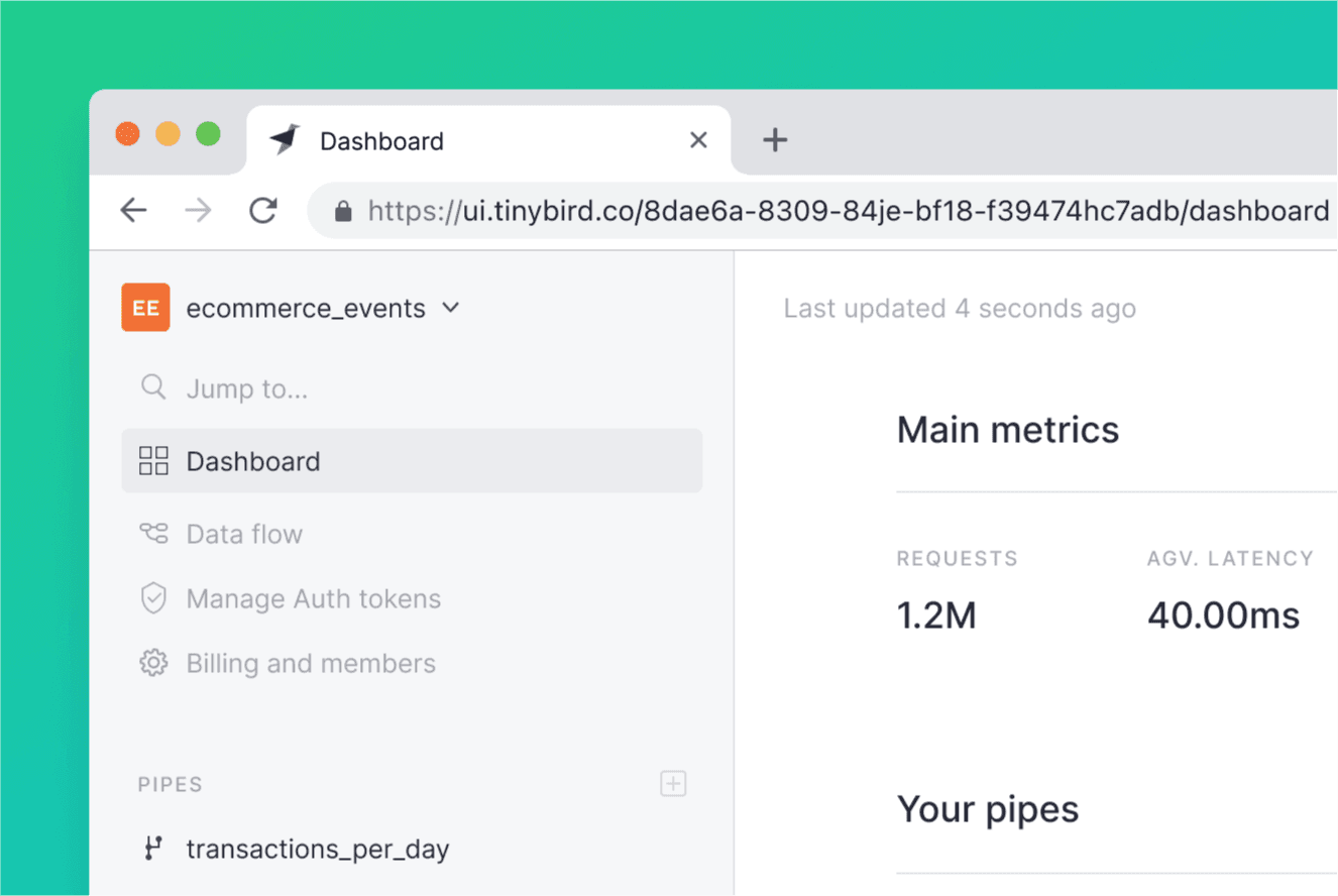 The basic primitives in Tinybird are data sources and pipes. Data sources store data, pipes transform it.